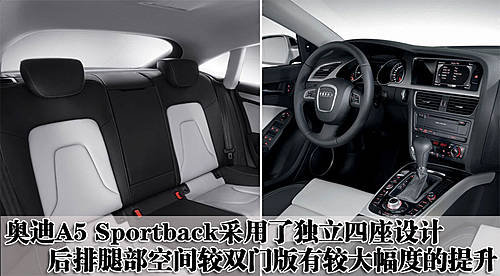 與很多四門轎跑車一樣,奧迪A5 Sportback四門轎跑車采用了獨立四座設計,前排提供運動座椅等選裝配置,后排空間尤其是腿部空間表現較雙門轎跑定位的奧迪A5有較大幅度的提升。