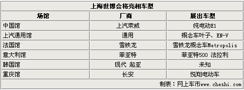 在本次世博會上,中國館中將展出上汽榮威推出的純電動車E1,這款車在本屆北京車展中已經正式亮相,預計將在2012年正式實現量產。在通用館展出的EN-V日前已在上海以全球首發的身份亮相,由于造型不同他們分別被命名為“驕”、“妙”和“笑”。這款雙人座EN-V電動聯網車創新地融合了電氣化和車聯網兩大技術,從而實現未來城市交通零油耗、零排放、零堵塞和零事故。其余將亮相的車型還包括雪鐵龍全新概念車Metropolis、菲亞特500、法拉利和長安悅翔電動車等。