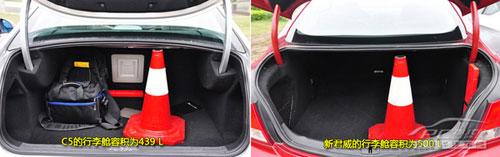 儲物空間對比還是用實物衡量比較直觀,接下來我們在兩輛車行李箱裝入了一樣的物品“雪花桶”,新君威的500L行李箱容積所帶來的優勢從圖片上就能看出,而學鐵龍C5的439L的行李箱要明顯劣勢新君威。