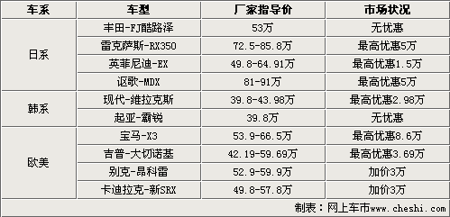 在眾多SUV車型的的范圍中,我們精選了10款各種具有獨(dú)特代表性的車型作為對(duì)象,其中囊括的日系、韓系和歐美車型,這樣更具有市場(chǎng)針對(duì)性,車型的價(jià)格范圍也從40萬(wàn)波及至80萬(wàn)元。整體呈現(xiàn)出事態(tài)強(qiáng)烈的各種狀態(tài),優(yōu)惠幅度最大的是寶馬X3車型,最高優(yōu)惠8.6萬(wàn);而在天平的另一端,加價(jià)最高的是別克昂科雷和卡迪拉克新SRX,加價(jià)額度均為3萬(wàn)元。當(dāng)然也有不加價(jià)的車型分別是豐田FJ酷路澤和起亞霸銳。