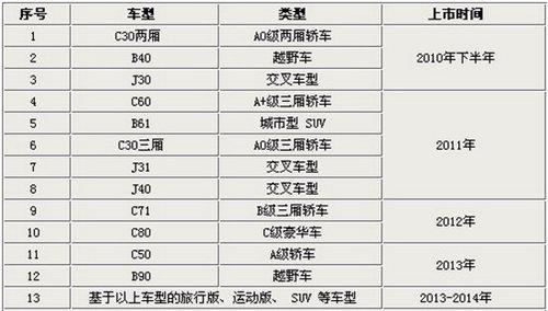 根據規劃,在2010-2014年的五年內,將會陸續推出共計20款全新車型,不過目前已經曝光的是12款新車,其中在2010年內有3款新車下線,而2011年將推出5款新車,2012年將推出基于薩博平臺的C71、C80兩款豪華車,2013年比較引人注目的是酷似攬勝的B90將推出。