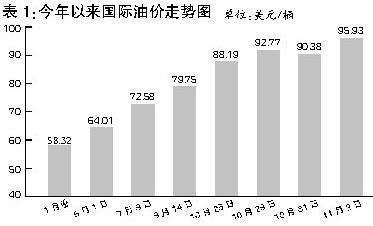 國內(nèi)油價上漲最直接的因素就是國際油價的大幅攀升。上周國際市場原油價格連創(chuàng)歷史新高,達到了94美元/桶。而在此前,紐約WTI原油期貨價格2007年年初價格為58.32美元/桶,3月份以后國際市場原油價格開始上漲,特別是近兩個月加速上升,9月14日和10月29日分別突破了每桶80美元和90美元。11月2日紐約原油期貨價格大幅上揚,比前一個交易日上漲2.44美元,終盤再創(chuàng)新高,收于每桶95.93美元。這個價格比起今年年初上漲了近40美元,漲幅超過80%。此間,國際油價雖然出現(xiàn)過小幅回落,但高位震蕩的格局一直難以改觀,甚至有愈演愈烈之勢。