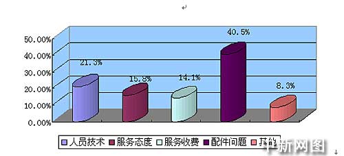 統(tǒng)計表明,服務(wù)收費、服務(wù)態(tài)度和配件供應(yīng)在關(guān)于服務(wù)質(zhì)量的投訴中占到70%以上。同一故障反復(fù)修理過程中工時等費用該由誰承擔的反映仍十分突出;而配件方面的投訴主要表現(xiàn)在配件供應(yīng)及時性、配件價格過高及質(zhì)量不能保證等方面。具體構(gòu)成比例:人員技術(shù)占21.3%,服務(wù)態(tài)度占15.8%,服務(wù)收費占14.1%,配件問題占40.5%,其他占8.3%。
