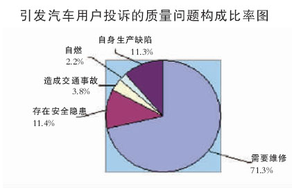 在汽車質量投訴方面,對發動機、變速器、轉向系統等核心部件的投訴比例下降,但對輪胎、車身附件、空調系統的投訴比二季度有明顯增加,安全隱患、生產缺陷的比率有所上升。各類投訴按程度分別為:需要維修才能使用的占71.3%,汽車質量問題存在安全隱患的占11.4%,因質量問題造成交通事故的占3.8%,自燃的占2.2%,廠家自身生產缺陷占11.3%。