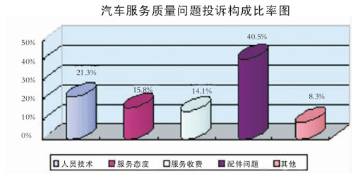 2007年三季度,全國汽車售后服務質量投訴表明,服務收費、服務態度和配件供應在服務質量投訴中占到70%以上。