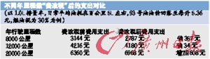 可以看出,按照現行油價計算,對于大部分車主來說,燃油稅率越高,所需支付的燃油部分的養車成本比重將更高;對于不同車型來說,排量越高,費改稅之后所需要支出的費用也越多;對于相同車型來說,每年行駛里程數越多,費改稅之后所需要支出的費用也越多。即使在燃油稅開征后,93號油油價回落至今年年初的每升5.36元,對于一輛一年行駛10005公里、油耗在5.0L每百公里左右的1.0L排量小車來說,在費改稅之后,還是需要多支付200多元油錢。