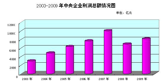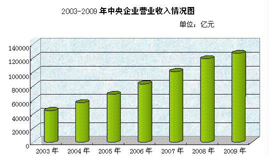 二、經(jīng)營規(guī)模情況。截至2009年底,中央企業(yè)資產(chǎn)總額210580.8億元,比上年增長19.5%;凈資產(chǎn)總額83968.9億元,比上年增長14.6%。2009年中央企業(yè)實現(xiàn)營業(yè)總收入126271.6億元,比上年增長6.4%。在全部中央企業(yè)中,2009年底資產(chǎn)總額超過千億元的企業(yè)有53家,比上年增加8家;2009年實現(xiàn)營業(yè)總收入超過千億元的企業(yè)有38家,比上年增加5家。在美國《財富》雜志2010年公布的世界500強企業(yè)中,上榜的中央企業(yè)有30家,比上年增加6家,比2003年增加24家。