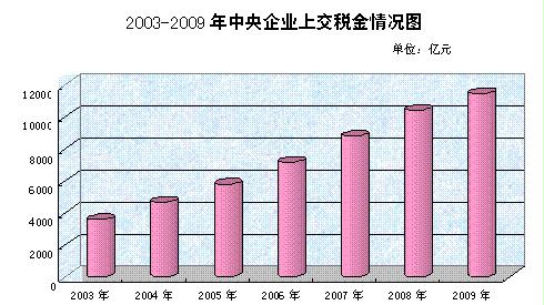 四、上交稅金情況。2009年中央企業(yè)實際上交稅金總額11474.8億元(含石油特別收益金680億元),比上年增長10.1%,比2003年增加7911.7億元,六年間年均增加1318.6億元,年均遞增21.5%。在全部上交稅金中,增值稅3782.3億元,占上交稅金總額的33%;企業(yè)所得稅2203.7億元,占19.2%;消費稅2071.9億元,占18.1%;營業(yè)稅1050.2億元,占9.2%;石油特別收益金680億元,占5.9%。2009年實際上交稅金總額超過百億元的中央企業(yè)有23家,比上年增加1家,比2003年增加15家。