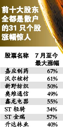 權威統計數據顯示,能夠在A股上市公司前十大流通股股東中“露臉”的個人投資者超過5000人。從中報來看,31只股票的前十大股東都是個人投資者,并且在7月份以來其整體表現十分出色,漲幅超過20%的就達22只。