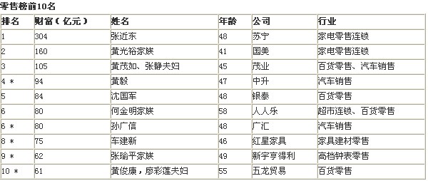 今年“胡潤(rùn)零售富豪榜”的前三甲風(fēng)采依舊。在國(guó)美上演激烈的權(quán)利爭(zhēng)奪大戰(zhàn)的一年里,蘇寧電器的張近東以財(cái)富304億元的絕對(duì)優(yōu)勢(shì)穩(wěn)坐首富寶座。國(guó)美的黃光裕在激烈的權(quán)利爭(zhēng)奪戰(zhàn)中保持第二位,財(cái)富160億元。茂業(yè)集團(tuán)的黃茂如、張靜夫婦在穩(wěn)步發(fā)展中以105億元繼續(xù)位居第三。