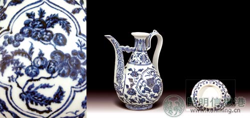 據云南典藏有關負責人介紹,拍賣“標王”青花開光折枝花果紋執壺通體施以白釉,釉質青白透澈,肥潤晶瑩,青花發色翠藍深沉,局部有鐵銹斑,圖案為上等“蘇麻離青”鈷料所繪。從文物藝術品的收藏價值來看,執壺整器端莊大氣,做工精湛,屬于明代永樂時期青花瓷中的代表之作。目前,除國內外的文物館藏之外,同類器物能在國內外市場上流通的可謂屈指可數,很少見諸于市,因此也就更加彌足珍貴了。
