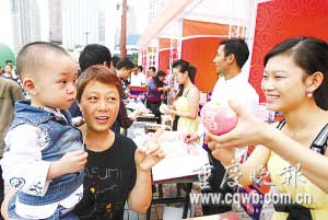昨天的朝天門廣場,微風伴著細雨,氣溫適宜,不少市民前來玩耍。廣場中央,是一個用蘋果搭成的展覽塔,廣場一側,是昭通市政府的蘋果展銷臺,堆積如山的蘋果吸引了廣大重慶市民,負責推銷的工作人員不停地給蘋果削皮,削好的蘋果很快就被市民吃了個精光。