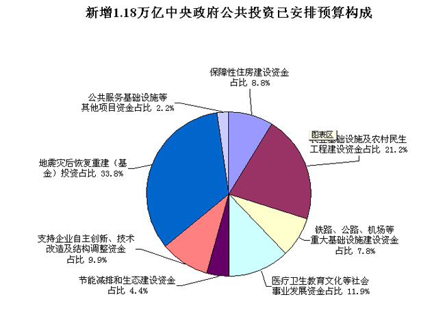截至目前,1.18萬億元新增中央政府公共投資已安排資金5915億元,分項目情況如下:用于保障性住房建設資金522億元,占8.8%;農業基礎設施及農村民生工程建設資金1253億元,占21.2%;鐵路、公路、機場等重大基礎設施建設資金460億元,占7.8%;醫療衛生教育文化等社會事業發展資金703億元,占11.9%;節能減排和生態建設資金260億元,占4.4%;支持企業自主創新、技術改造及結構調整資金585億元,占9.9%;地震災后恢復重建(基金)投資2000億元,占33.8%;公共服務基礎設施等其他項目資金132億元,占2.2%。