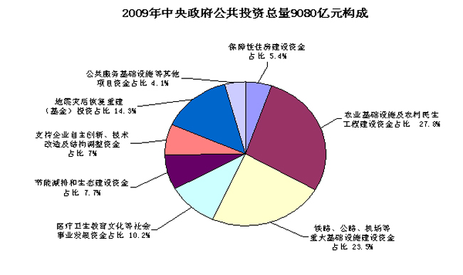 此外,2009年中央政府公共投資預算總量為9080億元,比上年增加4875億元,分項目安排情況如下:用于保障性住房建設資金493億元,占5.4%;農業基礎設施及農村民生工程建設資金2522億元,占27.8%;鐵路、公路、機場等重大基礎設施建設資金2134億元,占23.5%;醫療衛生教育文化等社會事業發展資金926億元,占10.2%;節能減排和生態建設資金696億元,占7.7%;支持企業自主創新、技術改造及結構調整資金633億元,占7.0%;地震災后恢復重建(基金)投資1300億元,占14.3%;公共服務基礎設施等其他項目資金376億元,占4.1%。