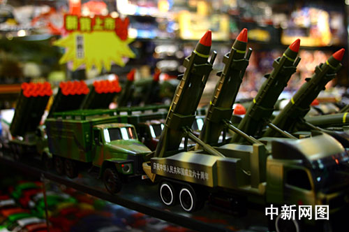 而在國際商貿城二期的旅游購物中心一家玩具商鋪,“移動加榴炮發射車”、“洲際導彈發射車”、“后勤保障車”等曾在閱兵式上“亮相”的軍事武器玩具模型,一個方陣一個方陣地排列著,接受著市場的“大閱兵”。