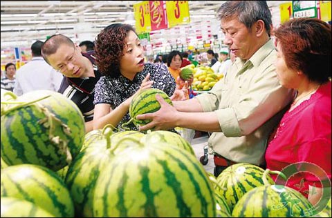 青年報記者張女士告訴本網:“上海到現在還沒有入夏,天氣涼快也不想吃西瓜,加上今年西瓜質量都不好,所以賣不出價錢! 張女士說,進入6月后,西瓜大量上市,但上海此時涼爽的天氣似乎在唱反調。氣溫不炎熱,西瓜攤人氣不足,所以攤主不得不促銷,西瓜的價格要比往年低好幾毛錢。