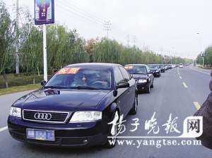 記者在現場看到,這支由28輛名車組成的豪華車隊,包括3輛寶馬、11輛奧迪、6輛豐田,以及別克、本田、帕薩特等高檔轎車。約9時10分左右,這支豪華車隊開始緩緩開動起來,最前面由一輛別克轎車“開道”,緊跟在后面的是一輛奔馳面包,車中坐著的就是當日車隊接送的“主角”——張良憲花費160萬元從外地買來的藏獒。這輛奔馳面包車前扎著大紅的綢花,車的側面掛著一條紅色條幅“中國名獒160萬元落戶宿遷張良憲藏獒繁育基地”。后面的車綿延跟進,每輛車都打著雙跳,緩緩前進,速度在20碼左右。