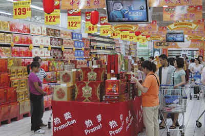 記者在家樂福超市白堤路店的月餅賣場看到,銷售柜臺上,一眼望過去大多數的產品都打上了醒目的促銷標簽,某些著名品牌的盒裝月餅甚至買一送一。除了鮑魚餡的精裝月餅價格在550元左右,禮盒月餅價格200元以下的占絕大多數。
