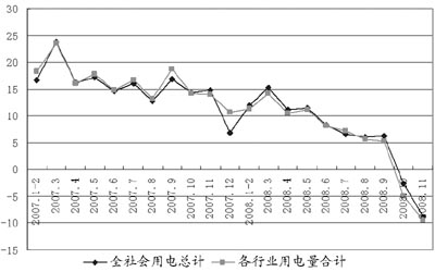 由國網北京經濟技術研究院副院長胡兆光博士繪制的一份“2007年以來各月我國全國及各行業用電量增長速度”圖表(圖1)顯示:全國月度用電量增長率在2007年3月曾高達23.88%,全行業(一、二、三產)月度用電量增長率也達到23.48%。此后便呈起伏式下滑,全國用電量10月份同比增長-2.18%,11月份同比增長-8.33%。