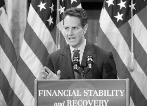 10日,美財長蓋特納在財政部宣布新的金融救援計劃 新華社/路透 圖