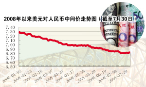 值得注意的是,在市場短期升值預期依舊強烈的同時,人民幣遠期匯率卻與此出現分化,近期境內銀行間外匯市場上,美元兌人民幣6個月和1年期遠期貼水點數正在逐步下滑,昨日分別報于1260基點和1770基點,較7月初已出現顯著下降。