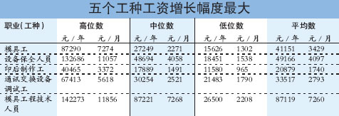 工資增長幅度最大的5個工種分別是模具工,增長了56.53%,年平均工資達到了41151元;設備保全人員,增長了48.64%,年平均工資達到了49166元;印后制作工,增長了47.04%,年平均工資達到了20879元;通訊交換設備調試工,增長了42.31%,年平均工資為33517元;模具工程技術人員,增長了41.86%,年平均工資高達87119元。(具體工資情況可見表格)