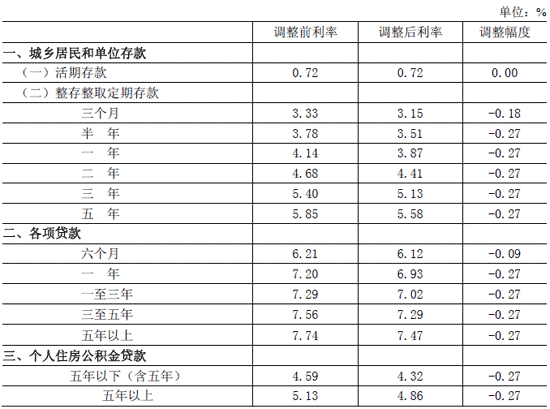中新網10月8日電 中國人民銀行決定,從2008年10月15日起下調存款類金融機構人民幣存款準備金率0.5個百分點;從2008年10月9日起下調一年期人民幣存貸款基準利率各0.27個百分點,其他期限檔次存貸款基準利率作相應調整。上表為央行公布的金融機構人民幣存貸款基準利率調整表。