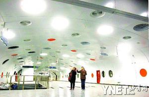 “太空艙”———這是記者對“金臺夕照”站廳裝修的直接印象。寬闊站廳內,兩側墻壁如括號般向內彎曲形成類似機艙的形狀。除了地面之外,無論墻壁還是天花板,圓形白光燈池和橘紅色色塊如密集的氣泡一樣分布,大的直徑可達1米,小的直徑才20厘米左右。面對如此現代風格的設計,“金臺夕照”仿佛被賦予了新的生命。
