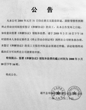 此后,遂平華強(qiáng)門口又張貼出公告,特別提示簽署《和解協(xié)議》領(lǐng)取補(bǔ)助費(fèi)的截止時(shí)間為2008年3月10日。
