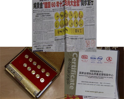 最近,北京多家知名媒體刊登大幅廣告,以著名書畫大師范曾的名義推銷純黃金“建國60年十二生肖大全套”,廣告中不僅聲稱耗用了68.6克純黃金鑄造了12枚純金生肖和巨幅畫卷,同時,還宣稱這是中國金幣史上第一套“建國十二生肖”的大全套。