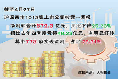 值得欣慰的是,這一加速下滑趨勢有望在今年一季度得到緩解。截至4月27日,兩市共1013家上市公司披露一季報,其中773家公司今年一季度實現盈利,占比76.31%。已披露一季報公司今年一季度凈利潤合計672.3億元,雖然同比仍然下降了25.76%,但和去年四季度的虧損46.33億元相比,已有明顯好轉。