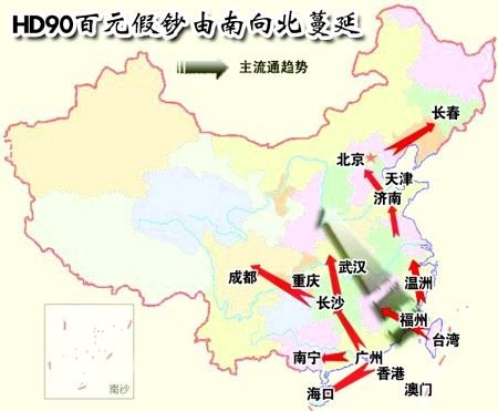 1月8日,央行就此事在北京召開記者招待會,央行貨幣金銀局局長葉英男澄清了HD90版假幣“高仿真”的傳言。部分城市的警方已經就假幣事件立案調查。然而,透過沸沸揚揚的假幣風波,人們不禁要問,如此大規模的假幣事件頻發,背后是怎樣一只無形的黑手?一條由南向北、自東向西的假幣蔓延路徑,漸漸浮出了水面……