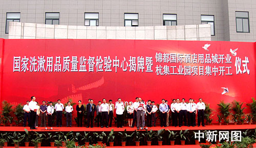 中新網邗江五月十八日電(記者 崔佳明 馬春陽)五月十八日,江蘇邗江在杭集鎮舉行國家洗漱用品質量監督檢驗中心揭牌暨錦都國際酒店用品城正式開業、杭集工業園項目集中開工儀式。中國輕工業聯合會綜合業務部副主任查長全、省質監局副局長張亞青、揚州副市長聞道才、邗江區委書記程裕松、區長韓方等領導出席,活動由區長韓方主持。