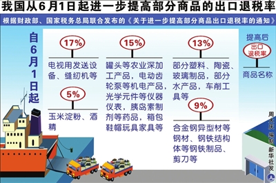 經國務院批準,財政部和國家稅務總局昨天聯合發布通知,宣布從6月1日起再度提高部分商品的出口退稅率,此次調整涉及農產品深加工、機電、鞋帽、玻璃制品、鋼鐵制品等制造業領域超過2600個稅目的商品。