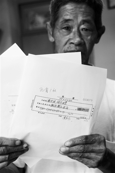 ●重慶江津區李市鎮孔目村一社的一名電費收費員,手持農民的電費繳納單據。上面顯示著孔目村一社農民陳治洪,2009年6月共用電7度,卻分攤了164度電的損耗,實際繳納電費88.9元,平均每度電12.7元。