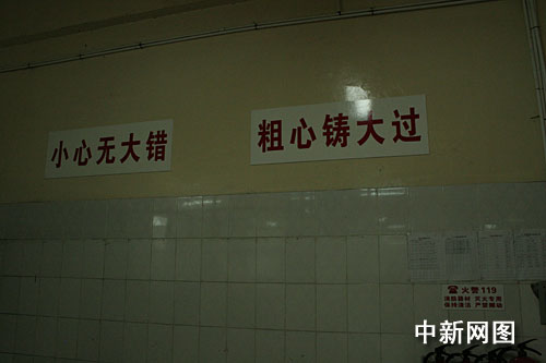 車間內張貼“小心無大錯 粗心鑄大過”標題提醒員工