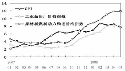 價格翹尾因素的影響依然較大。翹尾影響是2008年CPI漲幅難以顯著降低的重要因素。今年1月至5月,CPI累計上漲了8.1%。根據測算,其中翹尾因素為4.9%,新漲價因素為3.2%。如果以2007年12月的CPI水平為基準,今年6月至12月的翹尾因素平均僅為2.2%;考慮到今年前5個月的新漲價因素,如果以2008年5月的CPI水平為基準,則今年6月至12月的翹尾因素平均將上升至5.0%。也就是說,如果今年6月至12月沒有任何新漲價或新降價的因素(即月度環比價格指數為0),2008年全年CPI漲幅將為6.3%左右。考慮到6月份成品油價格和電力價格調整帶來的新漲價因素的影響,如果沒有其他新漲價或新降價因素,2008年全年CPI漲幅將提高到7.0%左右。今年下半年新漲價因素將主要來源于PPI向CPI的傳導以及進一步理順資源要素價格的可能幅度,新降價因素將主要來源于夏秋時節食品價格的季節性回落。如果新漲價因素占上風(即月度環比價格指數大于0),翹尾因素還將進一步上升,全年CPI漲幅將超過7.0%;如果新降價因素占上風(即月度環比價格指數小于0),翹尾因素將有所減弱,全年CPI漲幅將低于7.0%。