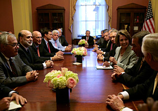 在公布金融救援計劃前,美國財政部長保爾森、美國聯邦儲備委員會主席伯南克和布什進行了緊急磋商;保爾森等官員隨后又拜會多位資深議員,爭取到了他們的支持。
