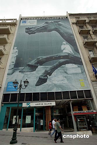 在希臘雅典市中心街頭,一幅數層樓高的宣傳畫以其獨具匠心的設計引人注目。中新社記者:王瑤