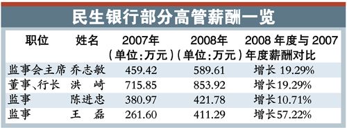 不過,董事、副行長洪崎在眾高管降薪中獨樹一幟,升職加薪。去年薪酬達853.92萬元,比上年增長138.07萬元,“因工作原因職級調整,2008年薪酬比照行長執行。”民生銀行在年報中解釋。