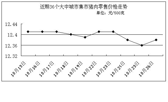 中新網(wǎng)10月29日電 國(guó)家發(fā)改委網(wǎng)站消息稱,據(jù)國(guó)家發(fā)展改革委價(jià)格監(jiān)測(cè)中心監(jiān)測(cè),上周(10.22-10.26,下同)全國(guó)36個(gè)大中城市豬肉(精瘦肉)集市平均零售價(jià)格每500克為12.39元,比上期(10.15-10.19,下同)下降0.08%。其中,12個(gè)城市豬肉價(jià)格小幅下降,其它城市豬肉價(jià)格與上期基本持平或略有上漲。