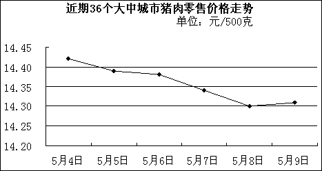 中新網(wǎng)5月12日電 國(guó)家發(fā)改委網(wǎng)站消息稱,據(jù)國(guó)家發(fā)展改革委價(jià)格監(jiān)測(cè)中心監(jiān)測(cè),上周(5.5-5.11,下同)全國(guó)36個(gè)大中城市豬肉(精瘦肉)平均零售價(jià)格每500克為14.34元,比前一周(4.28-5.4,下同)下降0.76%。
