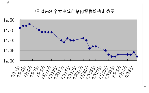 中新網8月11日電 據國家發改委網站消息,發改委價格監測中心監測顯示,上周(8月4日~8月7日)全國36個大中城市集市、超市豬肉(精瘦肉)平均零售價格每500克為14.33元,與前一周(7月28日~8月1日,下同)持平。