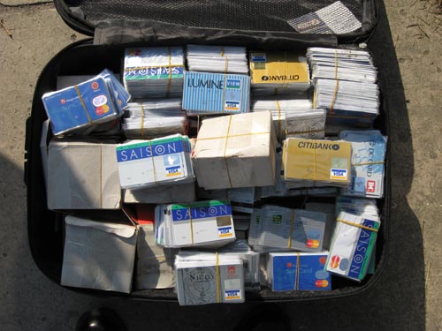 此刻,年輕女子略微猶豫了一下。當她抬頭看到民警威嚴的目光時,只好停住腳步,蹲下身體將拉桿箱的拉鏈打開。就在女青年打開箱子的一瞬間,民警的懷疑更甚。原來里面全是信用卡,卡面上都是外文,而且來自不同的銀行。信用卡被整整齊齊地碼放在箱子中。