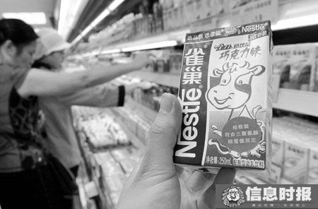 在家樂福超市萬國廣場店,記者看到光明純牛奶250毫升裝悄然回歸賣場;在吉之島超市天河城店,記者看到,昨日還未貼上綠簽的雀巢巧克力味和草莓味的配制型含乳飲料,昨日悄然換新裝。其生產(chǎn)日期標注為“2008年6月6日”,早于9月14日這一“分水嶺”。同時,記者在7-11便利店天河南店也看到了雀巢這兩款配制型含乳飲料重新擺上貨架售賣。