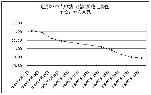 中新網5月11日電 據(jù)國家發(fā)展改革委價格監(jiān)測中心監(jiān)測,上周(2009.5.4-2009.5.8,下同)36個大中城市集市、超市豬肉(精瘦肉)平均零售價格每500克為10.94元,與前一周(2009.4.27-2009.4.30,下同)相比下降1.88%。