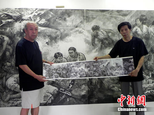 記者在唐山市一社區(qū)里,見到了四位作者中的喬文科與孫淑文。據(jù)二位畫家介紹,《唐山大地震祭》巨幅水墨畫長卷裝裱完后高2.35米,長度近百米,歷經(jīng)四年艱苦努力,終于完成。