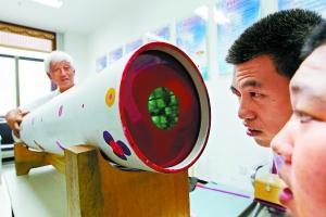 ▲ 老李參加了殘聯的幫扶活動,義務輔導智障人士制作簡單的萬花筒,進行康復訓練。為了讓學員們產生興趣,他特意搬來自己制作的目前國內最大的萬花筒,長達1.4米。