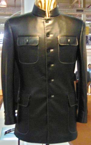 昨天下午,記者現場看到,該展區的中山裝除了傳統的老款式外,還包括了很多新穎的款式,例如,用香云紗、皮料制作的中山裝,用意大利進口面料制作的中山裝……