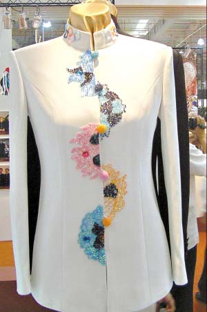 有一款中山裝制作最為新潮,衣領圖案是奧運五環,前襟圖案則是一條飛龍,如果仔細觀察可以發現,該條飛龍是用類似奧運福娃的局部圖案巧妙地拼接而成的。